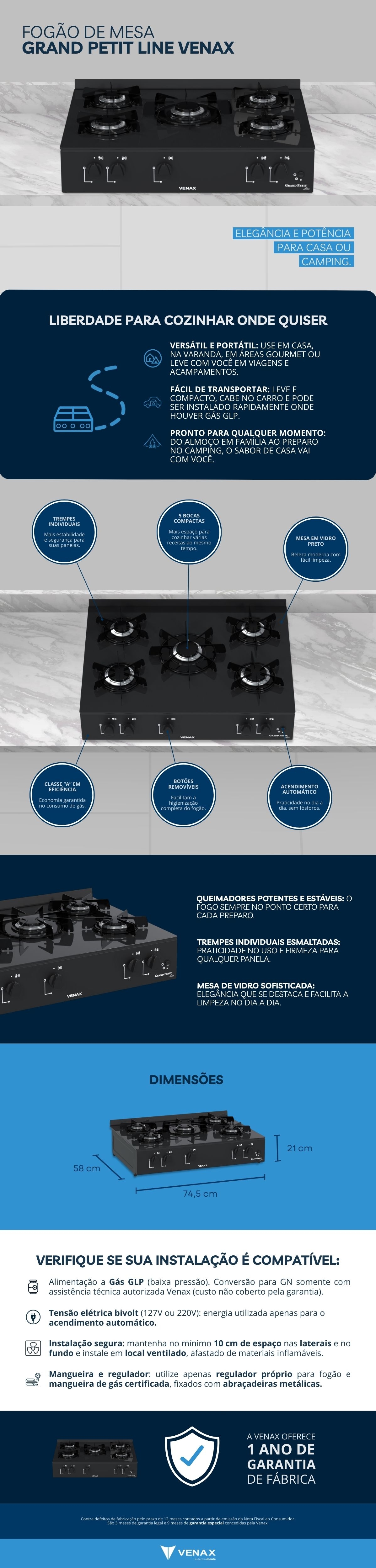 Fogao de Mesa 5 Bocas Venax Grand Petit Line Preto Gas GLP