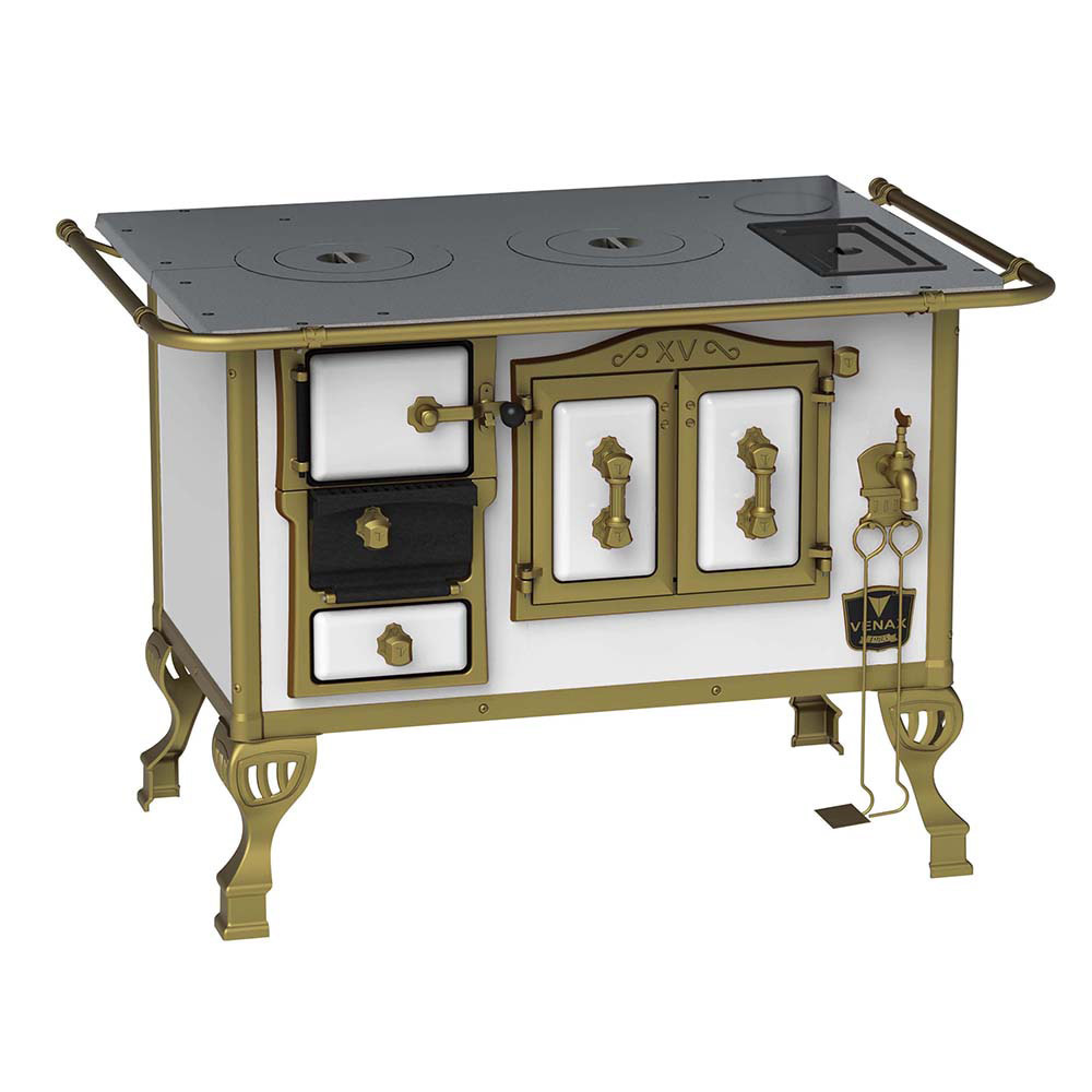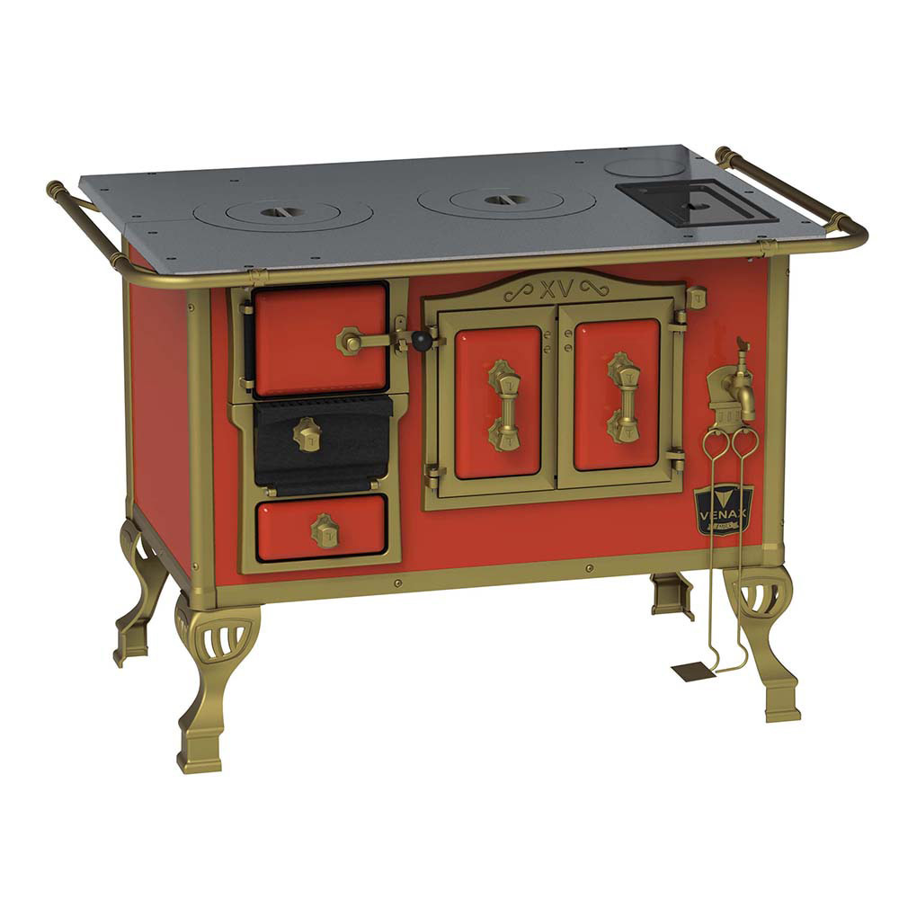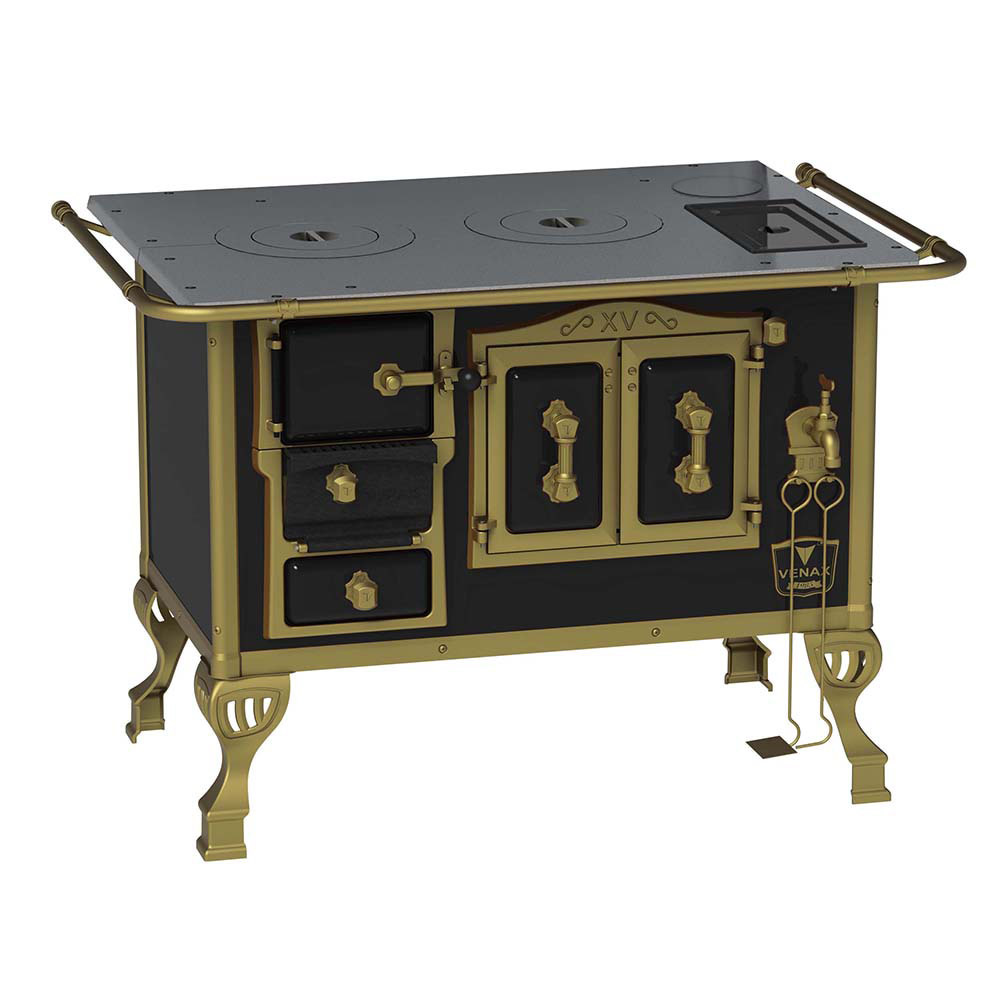 Fogão a Lenha Nº2 Duque, com Chapa de Ferro Fundido Polida, Caldeira de Alumínio Teflonada, Corpo em Chapa QCV Esmaltada, Tranca na Porta da Fornalha, Porta Dupla no Forno, Porta de Ar em Ferro Fundido, Cantoneiras Reforçadas com Design do Século XV, Suporte dos Varões Reforçados, Puxadores e Guarnições das Portas em Estilo do Século XV, com Acabamento em Ouro Velho.