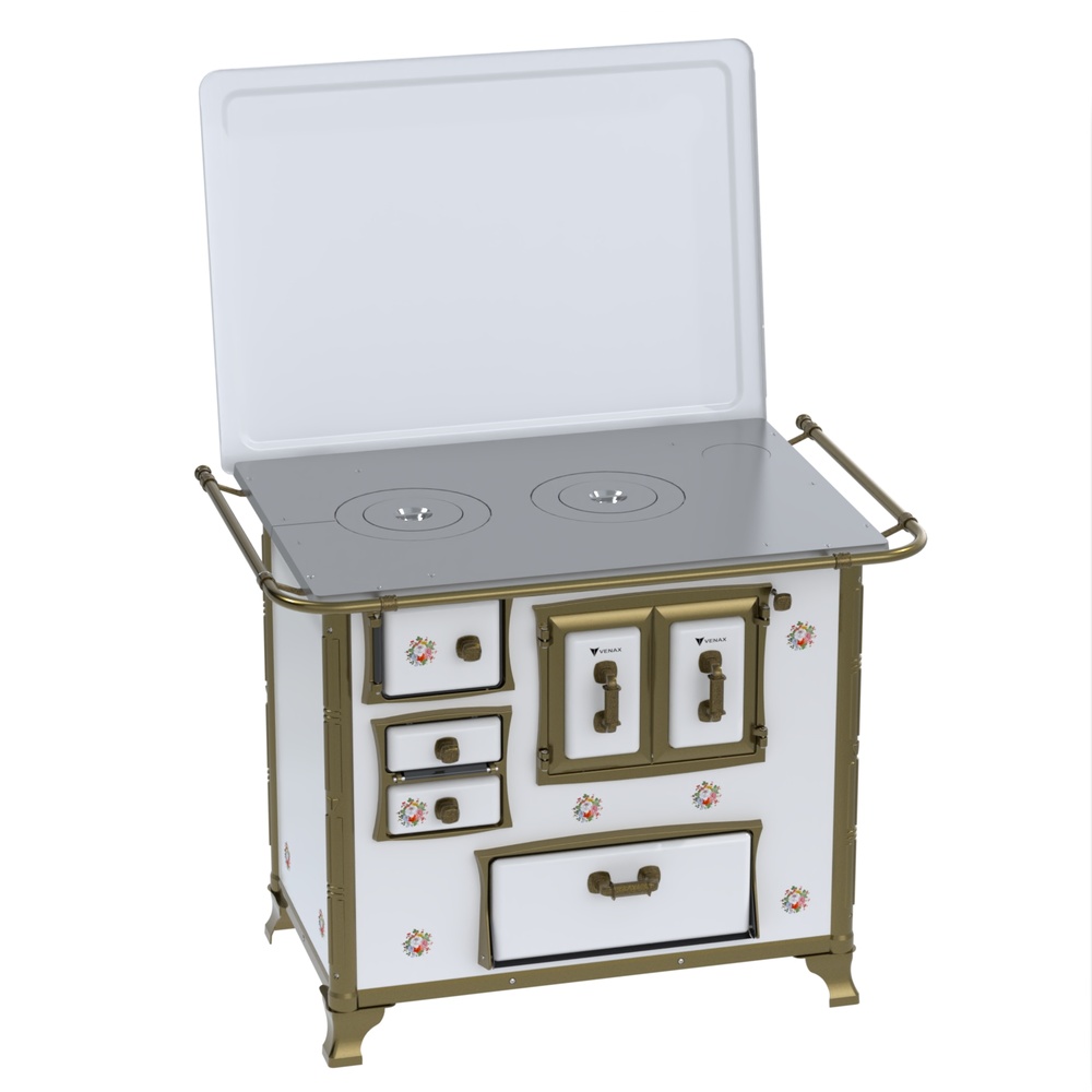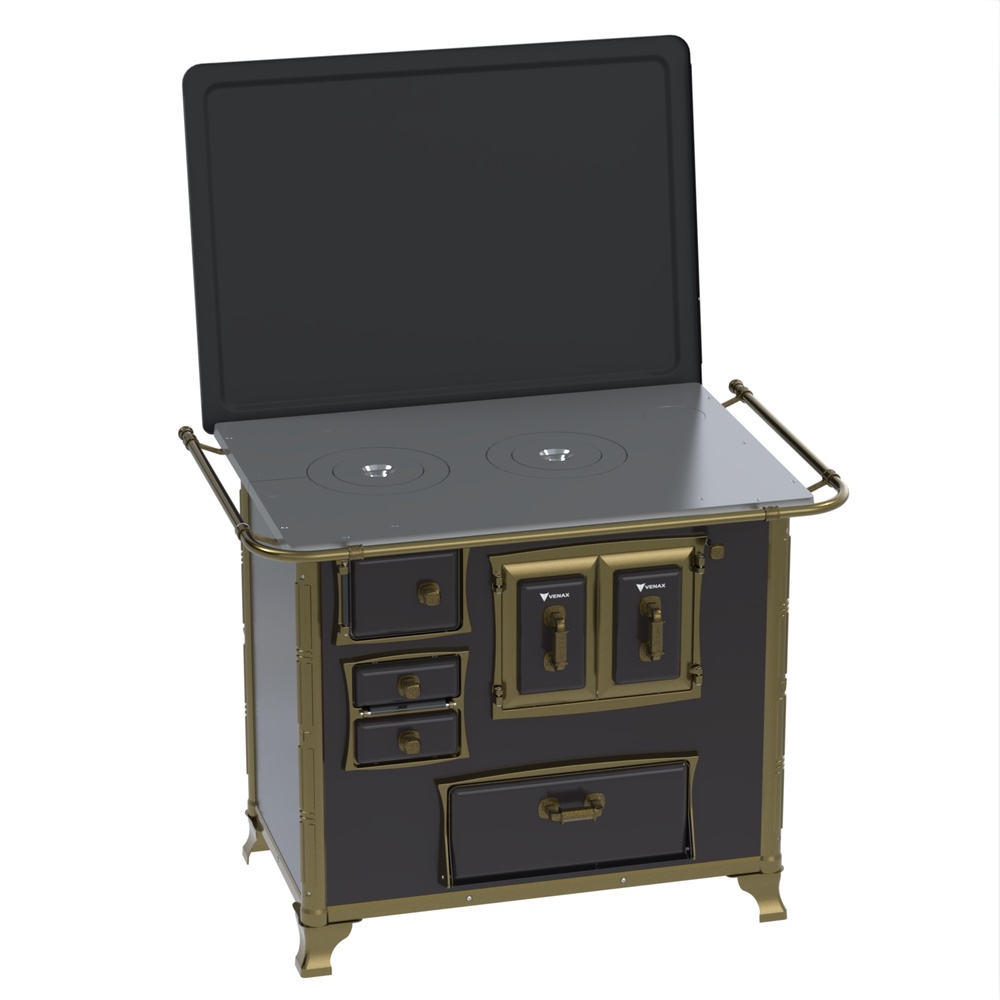 Fogão a Lenha Nº2 Renaissance, Chapa de Ferro Fundido Polida, Tampa com Pintura Epóxi, Fornalhas de Tijolos, Grade do Fogo em Ferro Fundido, Porta Dupla no Forno, Com Estufa, Guarnições das Portas e Pés em Alumínio Banhados em Ouro Velho, Corpo e Forno Esmaltado. Puxadores, Cantoneiras, Suportes e Varões de Proteção com Acabamento em Ouro Velho.
