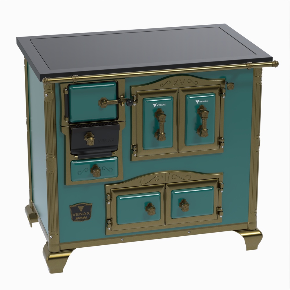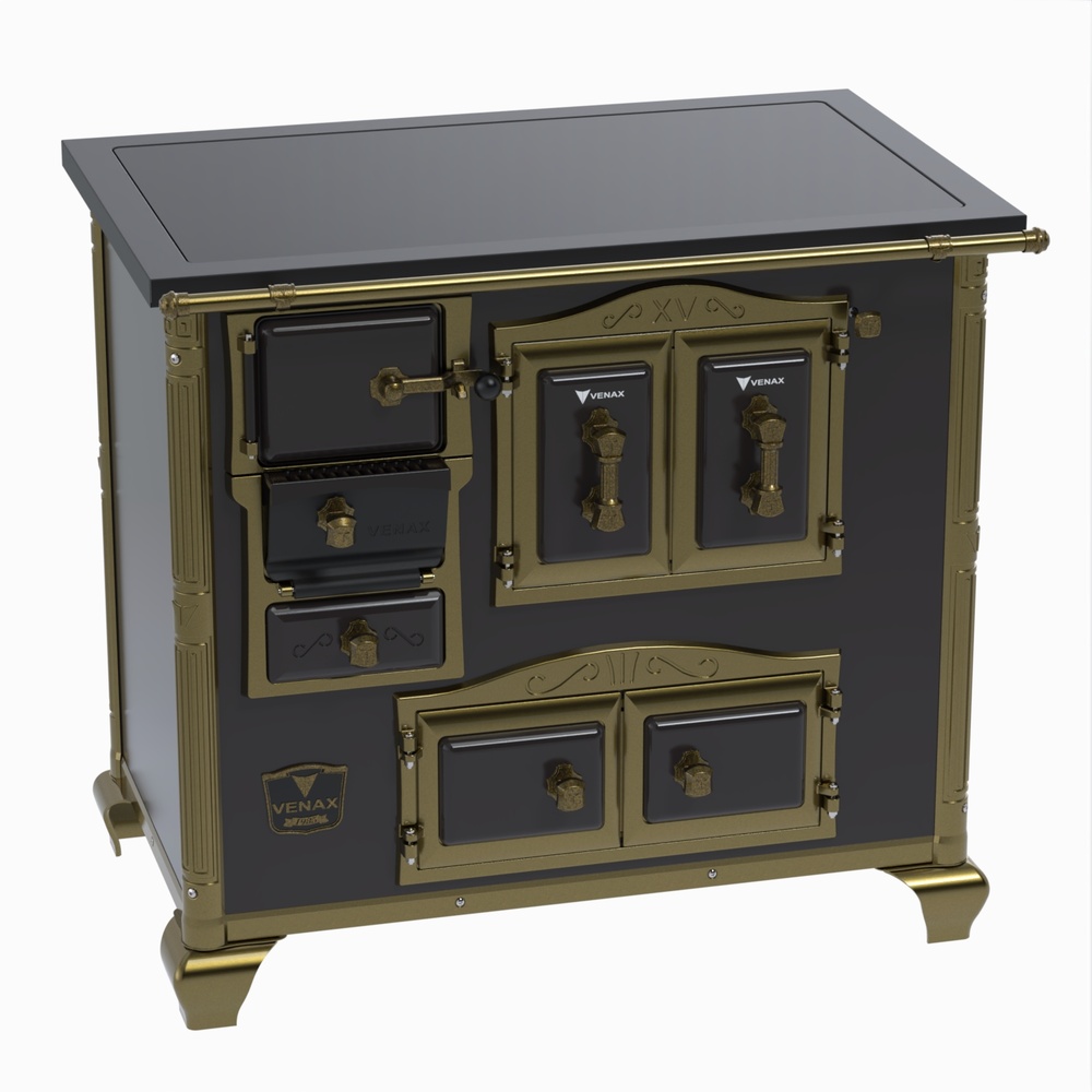 Fogão a Lenha Nº2 Imperador Premium, Chapa de Vitrocerâmica, Varão de Proteção Frontal Ouro Velho, Corpo em Chapa QCV Esmaltada, Tranca na Porta da Fornalha, Porta Dupla no Forno e Estufa, Porta de Ar em Ferro Fundido, Cantoneiras Reforçadas com Design do Século XV, Suporte dos Varões Reforçados, Puxadores e Guarnições das Portas em Estilo do Século XV, com acabamento em Ouro Velho.