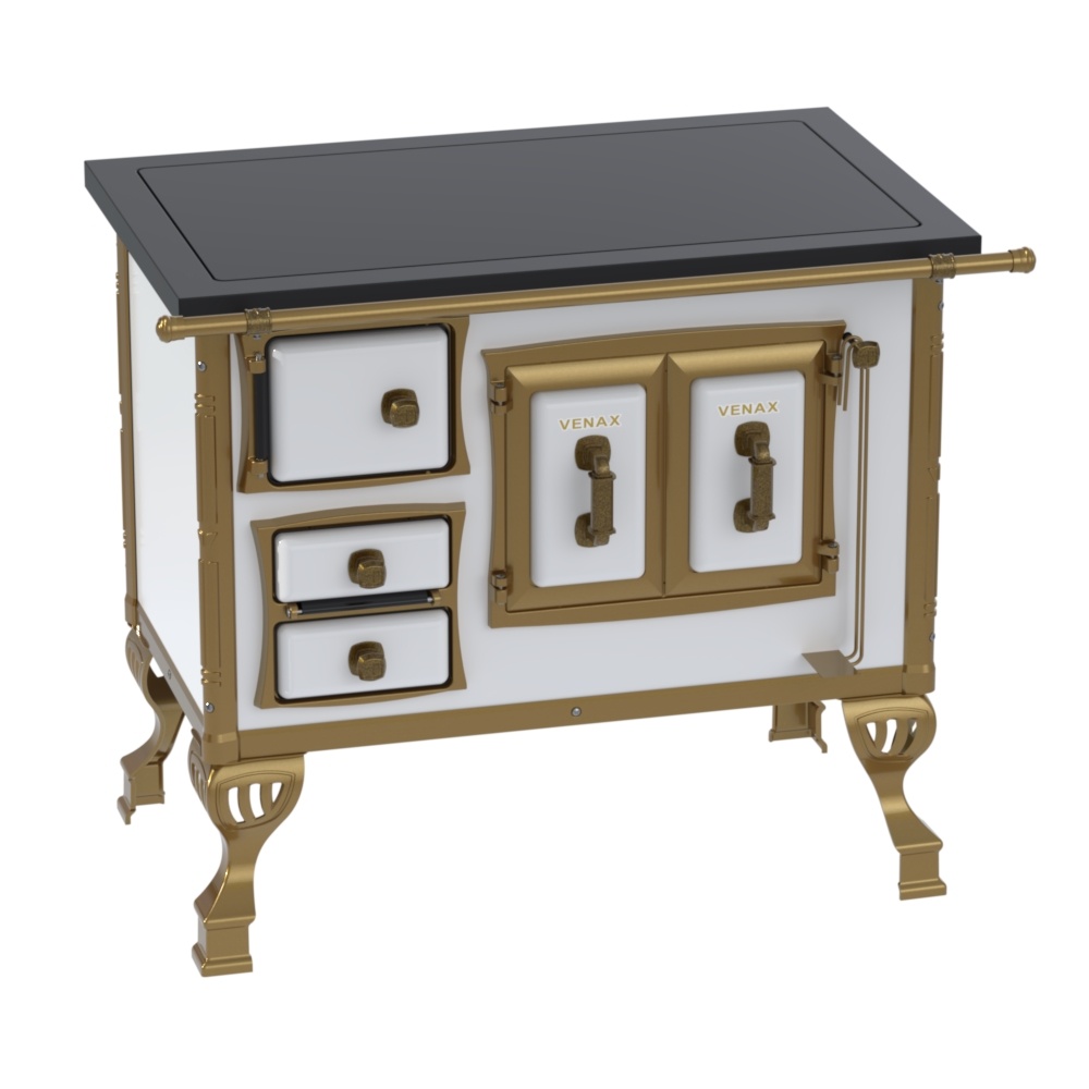Fogão a Lenha Nº1 Colonial Premium: Chapa de Vitrocerâmica com Moldura em Preto, Fornalhas de Tijolos, Grade do Fogo em Ferro Fundido, Porta Dupla no Forno, Guarnições das Portas e Pés em Alumínio Banhados em Ouro Velho, Corpo e Forno em Chapa QCV Esmaltada. Puxadores, Cantoneiras, Suportes e Varão de Proteção Frontal com Acabamento em Ouro Velho.