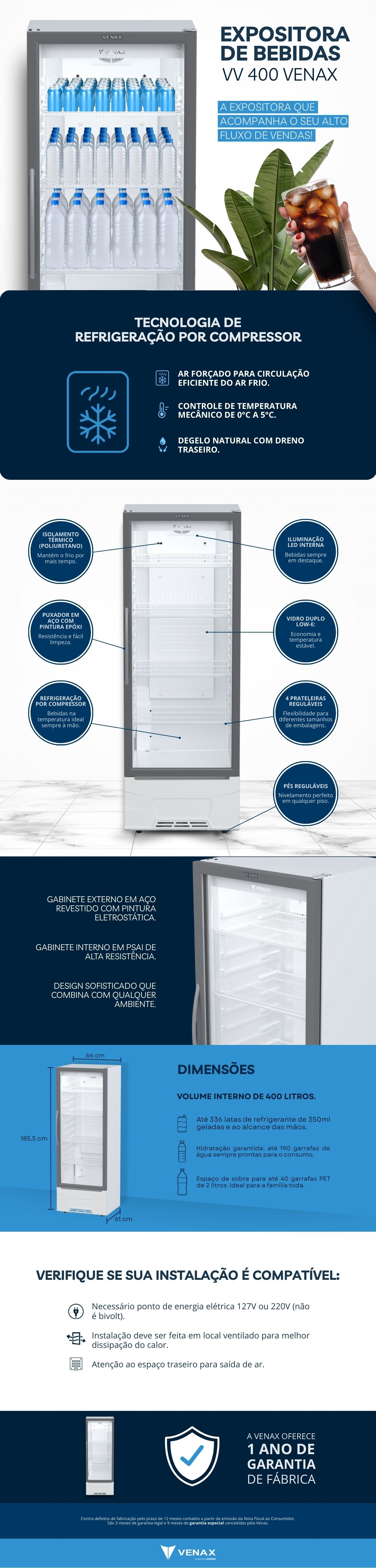 Expositora de Bebidas VV 400. Porta de Vidro Duplo Low-E, Puxador em Aço Pintado em Epóxi,Controle de Temperatura Mecânico Regulável de 0ºC até 5ºC, Iluminação Interna em LED na Cor Branca, Quatro Prateleiras Reguláveis, com Sistema de Refrigeração por Compressor.