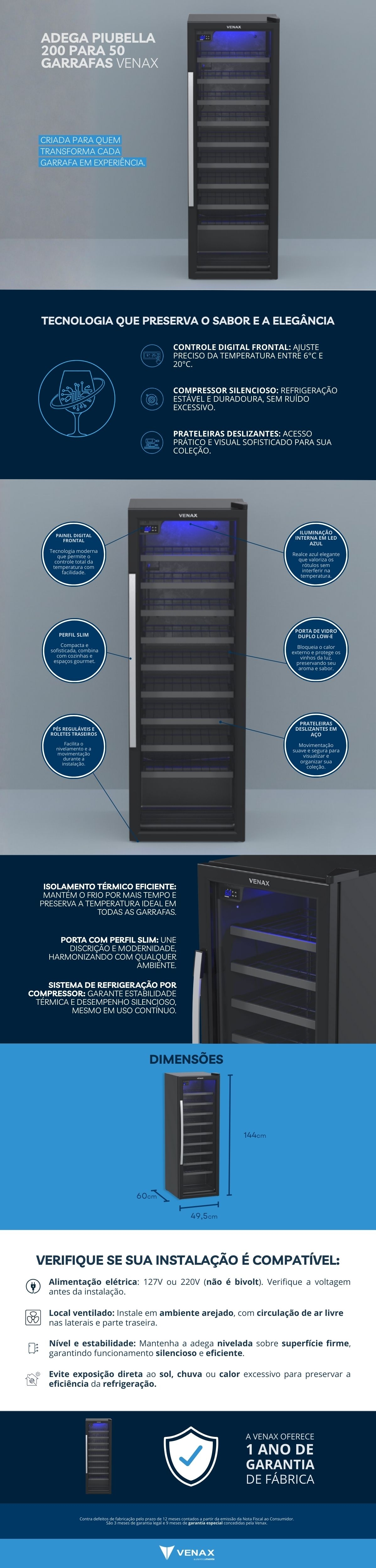 Adega Piubella 200. Conta com Capacidade para até 50 Garrafas com Diâmetro de até 9cm. Porta de Vidro Duplo Low-E, Puxador em Alumínio Escovado, Controle de Temperatura Digital Regulável de 6ºC até 20ºC, Iluminação Interna em LED na Cor Azul, Prateleiras Deslizantes, com Sistema de Refrigeração por Compressor.